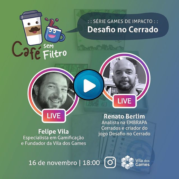 Em novembro de 2021 tive o prazer ser ser convidado pela Vila dos Games, uma comunidade de criadores de Games que promove experiências gamificadas únicas e transformadoras. O evento foi o Café sem Filtro, uma iniciativa para discutir a criação de jogos no Brasil, especialmente em jogos que tenham algum impacto social. No meu caso o que atraiu o interesse da Vila foi o trabalho com o projeto a aplicação em escolas de um jogo educativo sobre o Cerrado.