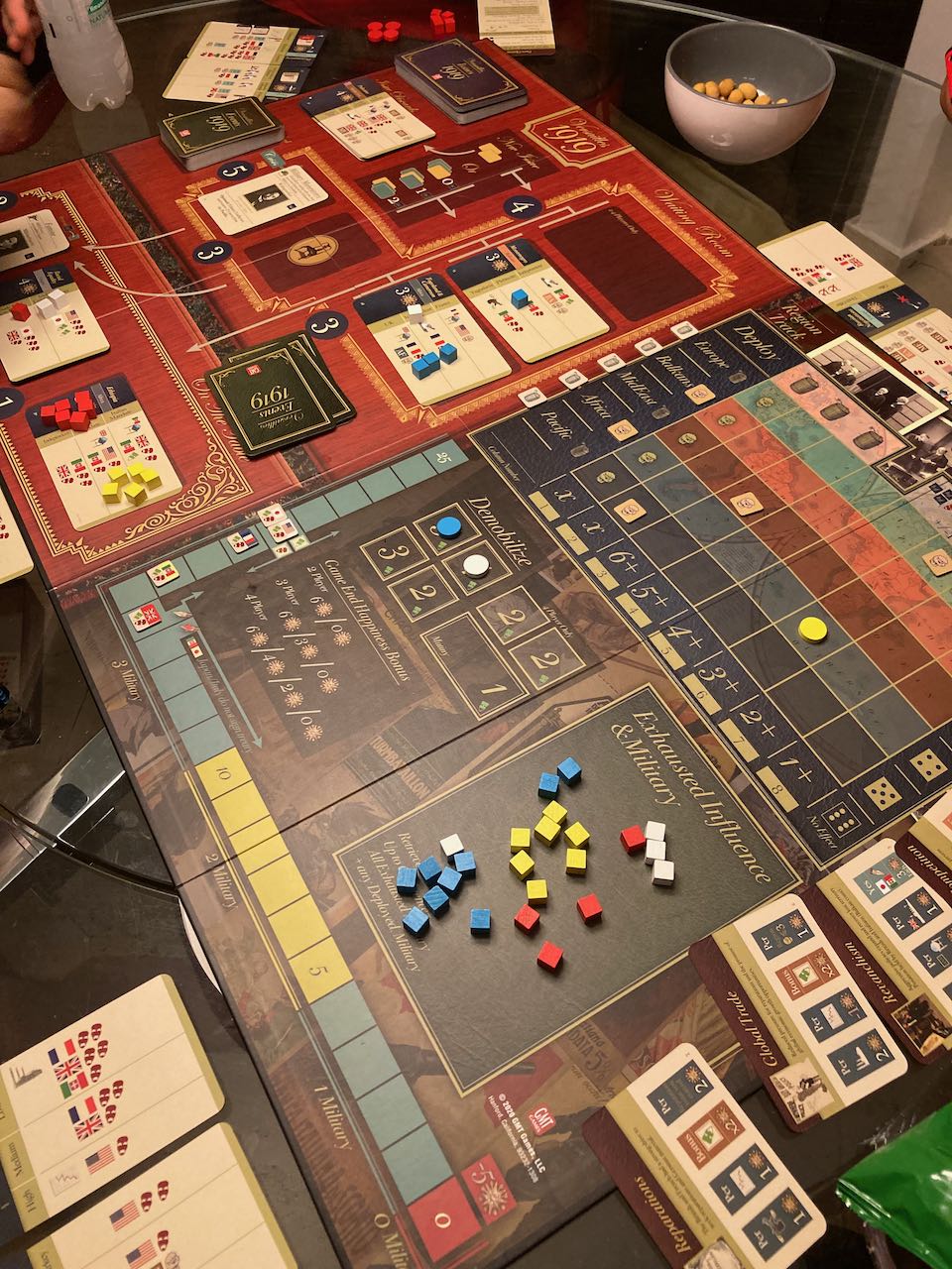 Na minha partida eu fui a França (peças azuis), que queria ganhar o máximo com reparações, foi o primeiro país a desmobilizar exércitos para aumentar a popularidade do governo. Teve vários interesses na região dos Balcãs, brigou diversas vezes com os Estados Unidos (brancas) por influência global, negociou com a Inglaterra (vermelhas) e Itália (amarelas). Ainda assim fiquei em quarto lugar no jogo, o primeiro ficou com o Reino Unidos. Considerando que era a primeira vez, achei um resultado bem aceitável.