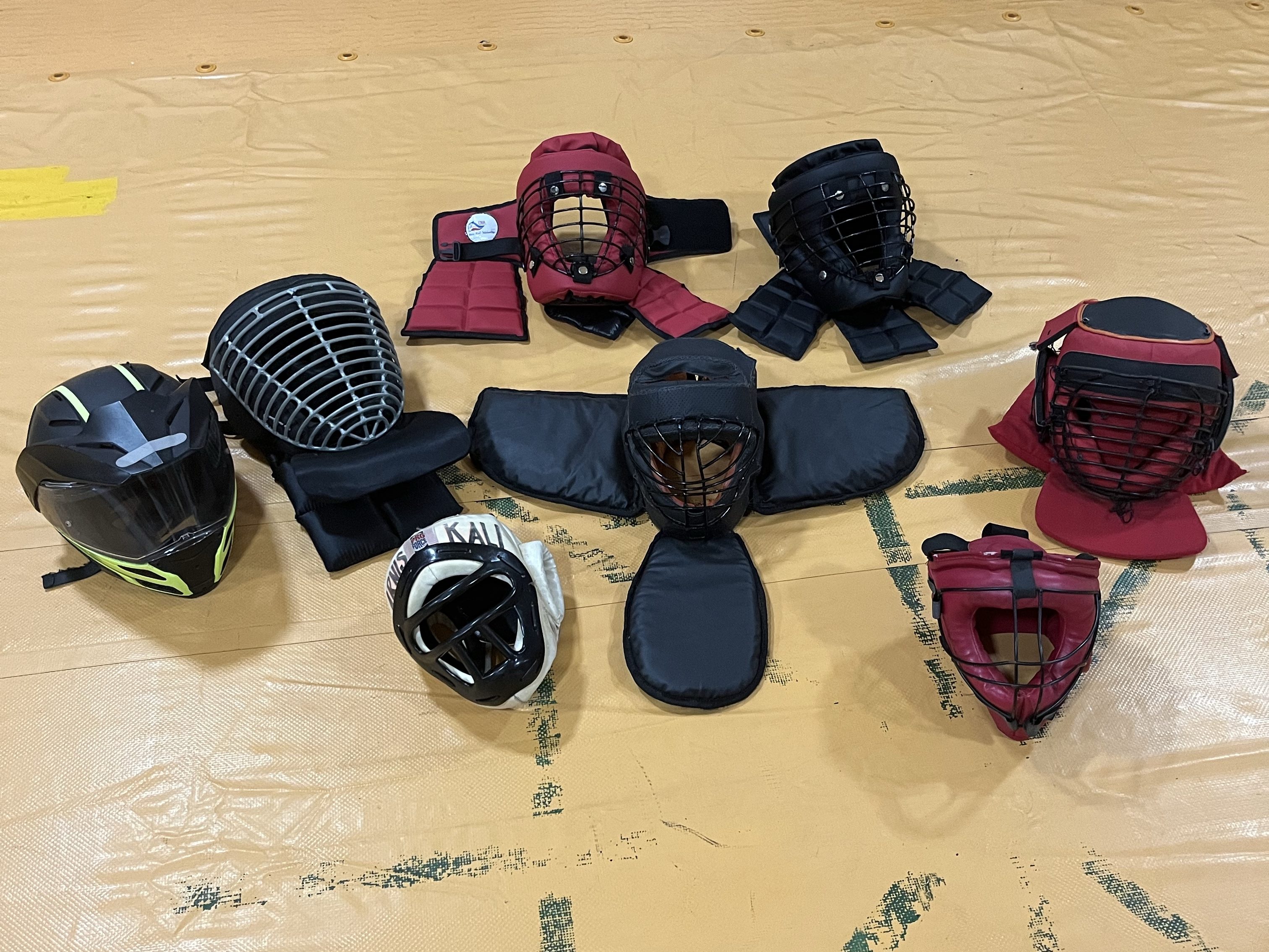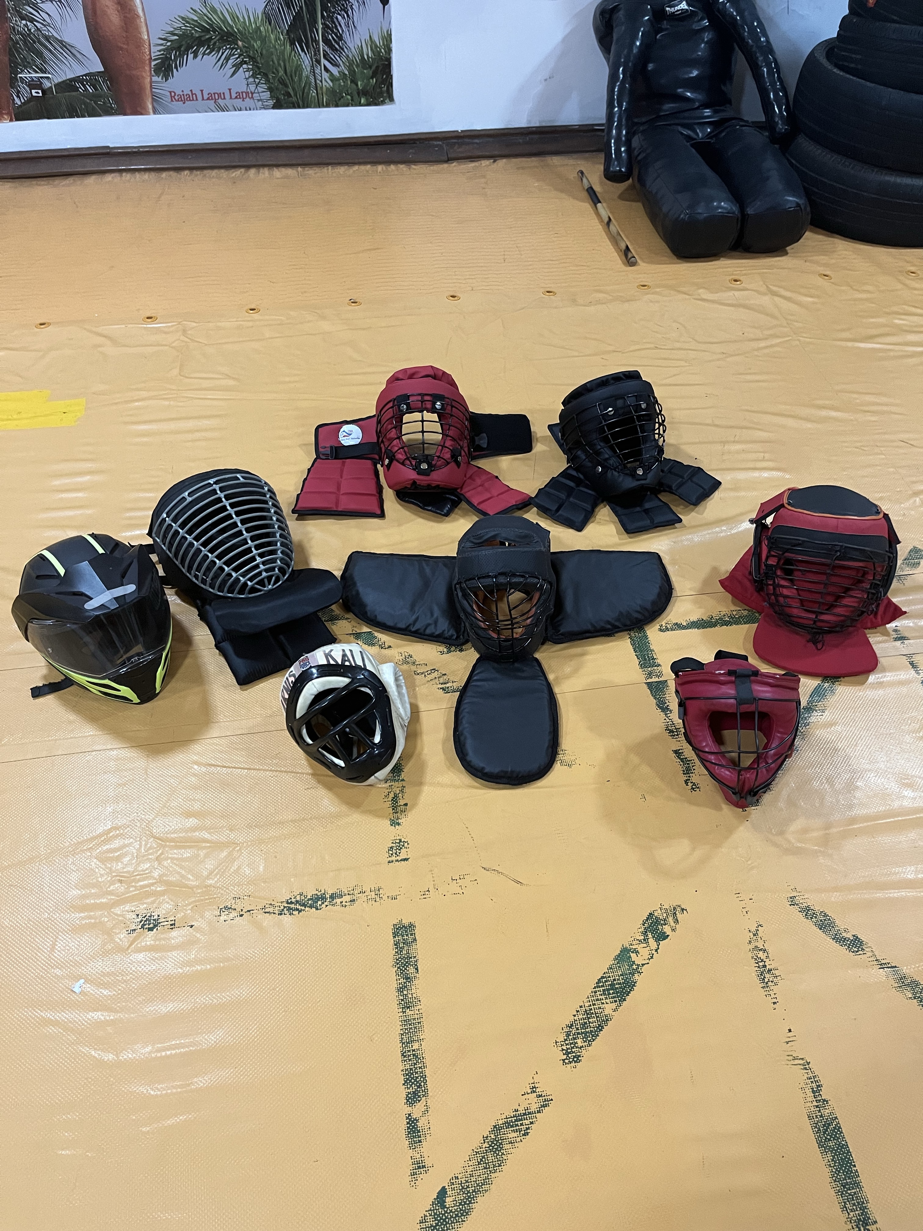 O mestre de Arnis Kali Dada Inocalla já ensina artes marciais desde os anos 70 e viu a demanda por equipamentos de proteção e sua evolução ao longo do tempo. Ele sempre incentiva que os alunos comprem e usem equipamento de proteção. Ele chegou até mesmo a propor, criar e experimentar diversos equipamentos e combinações para seu treinos. Ele conta que nos anos 80 ele experimentou com capacetes de moto e bastões de madeira, mas viu em primeira mão a demanda por material mais especifico. A variedade na foto dos capacetes demonstra a evolução desse processo e as diversas demandas de treinamento.