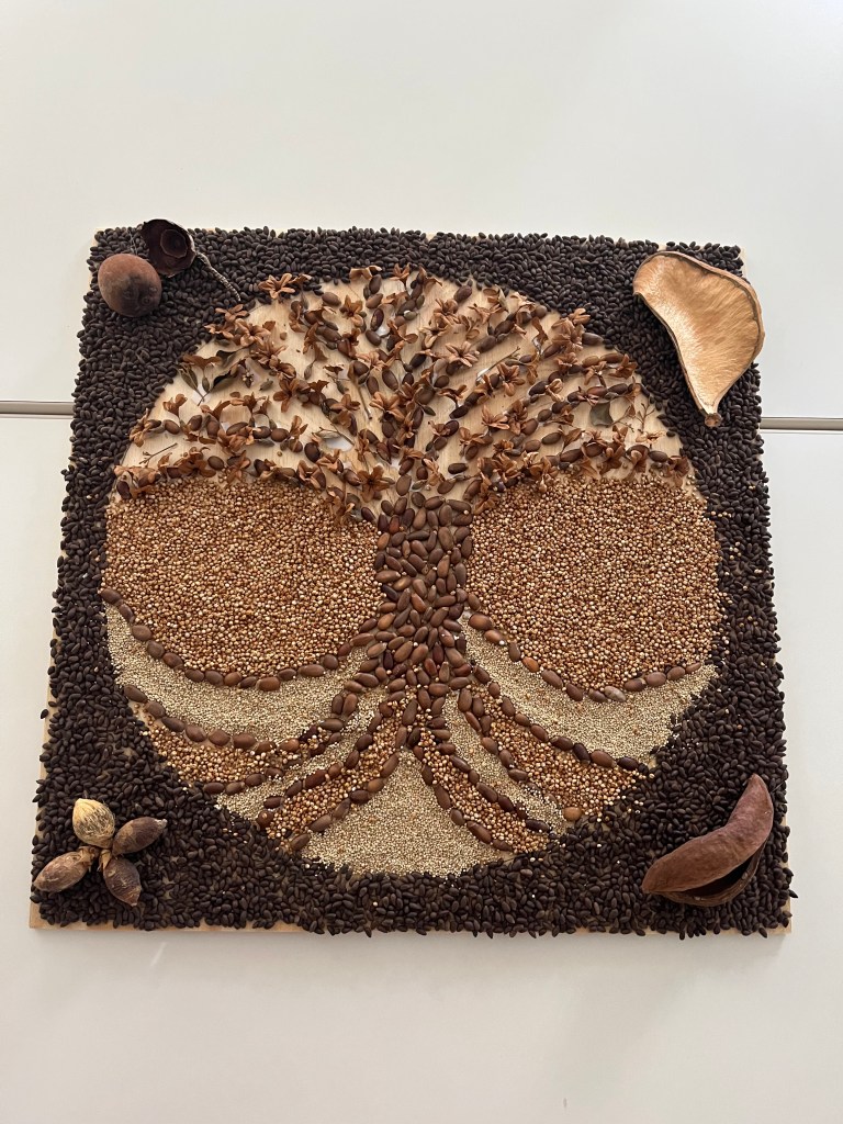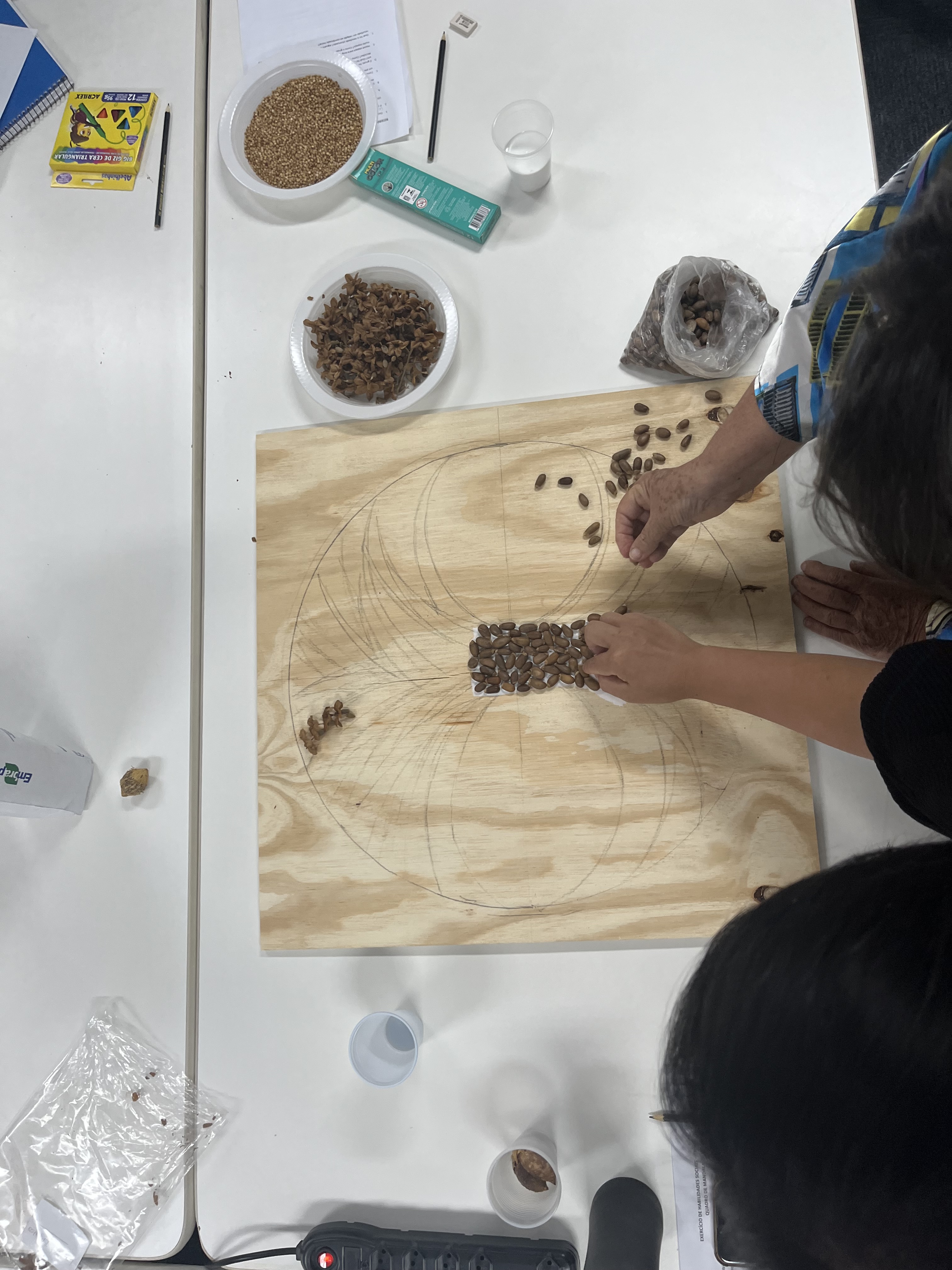 Em seguida tivemos um discussão, amigável, sobre começarmos a colocar as sementes ou se poderíamos parar nesse ponto e continuarmos no outro dia. Uma colega foi assertiva no ponto que devíamos avançar tanto quanto possível, se dispondo a começar a colagem. Sugeri que se fosse começar o melhor seria fazer pelo tronco, que estava justamente no centro e ajudaria a garantir a forma no outro dia. Ela fez questão de dar o exemplo e começar, eu nem imaginava como ela estava certa.