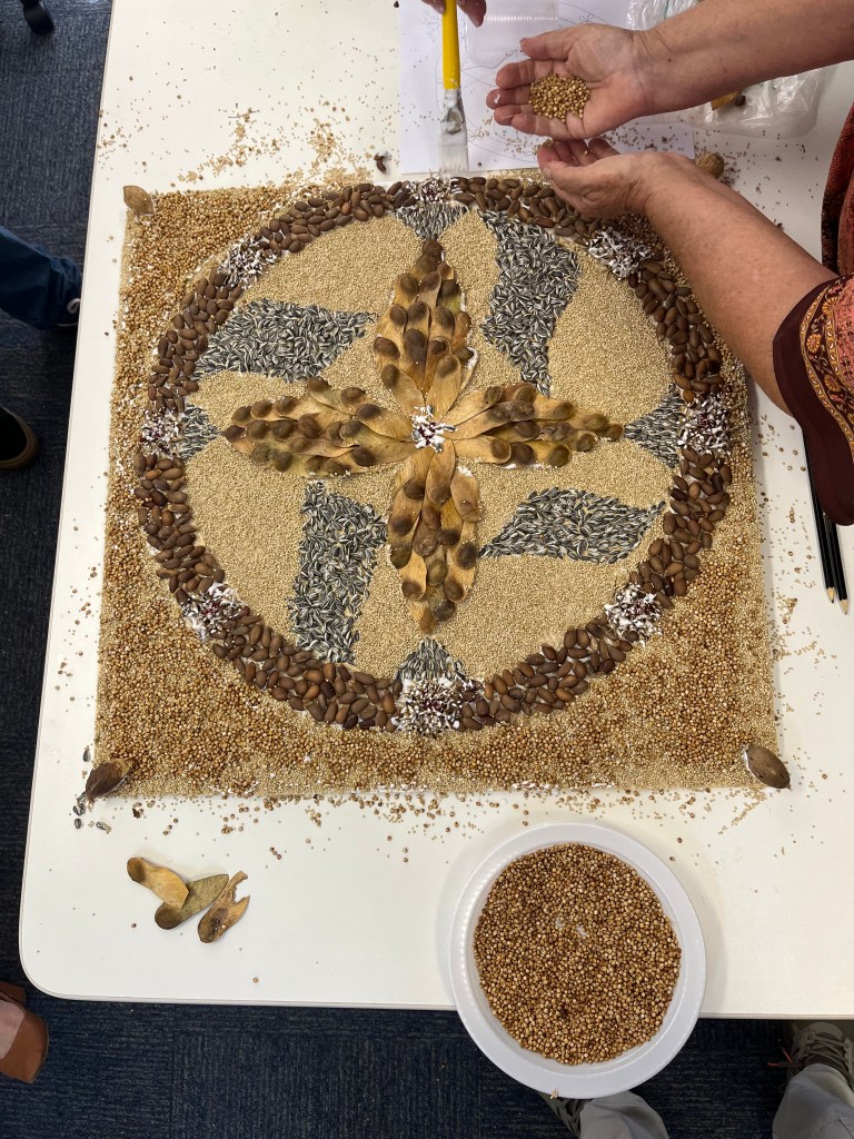 A nova mandala ficou pronta, com algumas pequenas diferenças em relação ao projeto original. O grupo anterior havia planejado que umas certas figuras fossem peixes, mas as sementes não permitem detalhar muito e nem imaginamos peixes numa mandala de sementes. Talvez seja um reflexo do material, mas a maioria dos grupos tendeu a temas mais relacionados à terra, agricultura e vegetais.